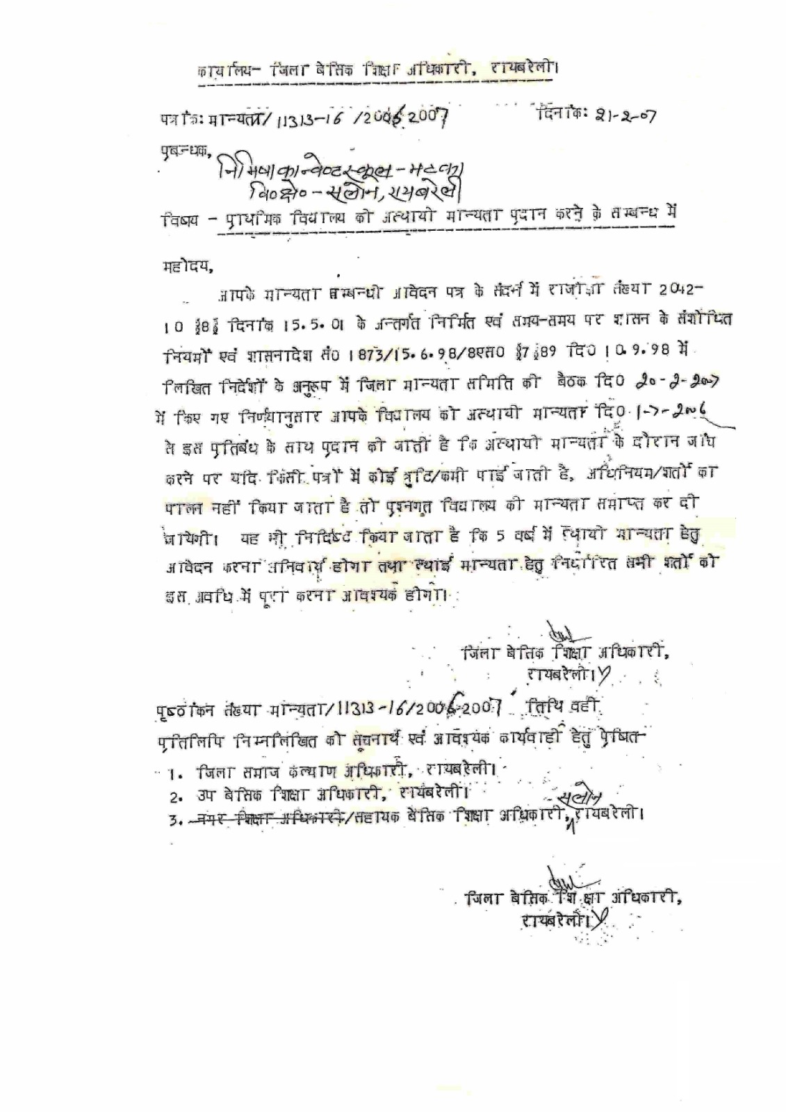 The School is founded  by Shri A.K. Shukla  in the memory of his beloved doughter  Late NIMISHA and was inaugurated on 23 july 2007 by reverend Mr. Rahul Gandhi, MP Amethi constituency. It is situated at the link  road to jagatpur salon about 12 Km away from jagatpur and 4 Km away from  salon to matka village in Raebareli disstt. It presently conduct classes from Nursery to Senior. Secondary (10+2) in all the three streams (Science, commerce & Humanties) has fully digital classes with the help of Tata class edge.